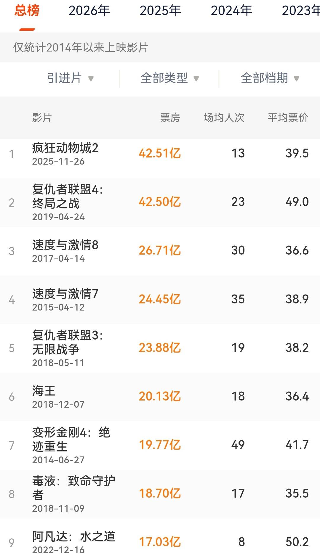 截止2026年1月5日,迪士尼动画电影《疯狂动物城2》在中国内地上映41天,累计票房42.51亿元,超过《复仇者联盟4》的42.5亿元,成为新的进口片票房冠军。这部合家欢动画每到周末就会