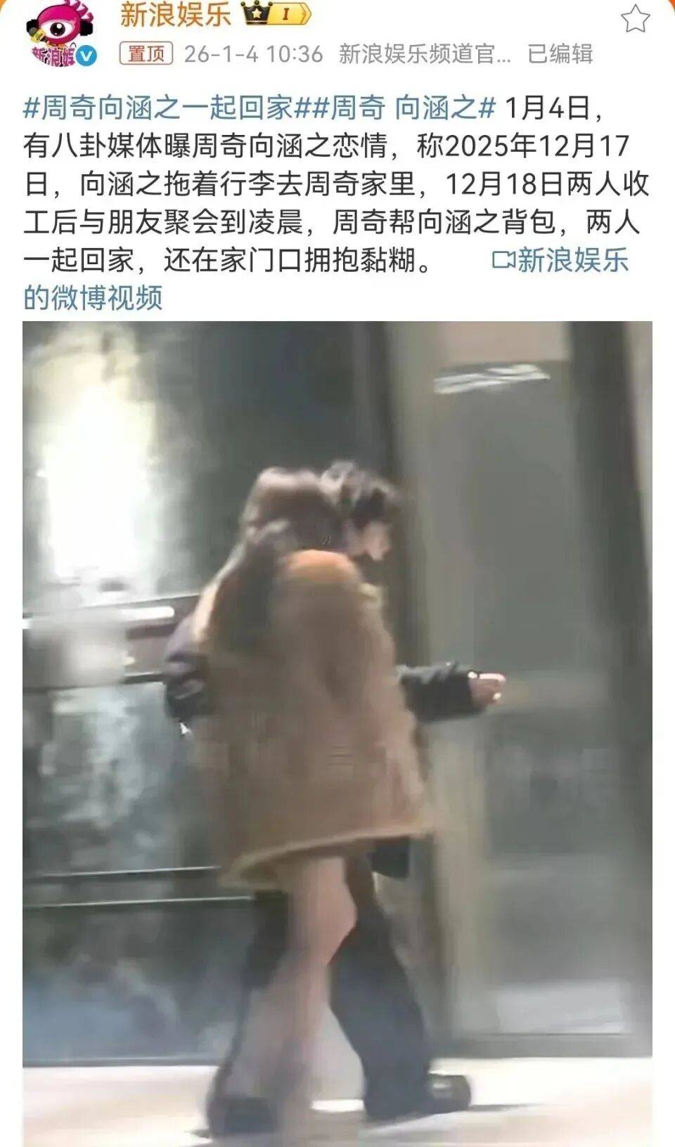 2025年12月17日,向涵之被拍到携带行李入住周奇住所;次日两人共同参加搜狐时尚盛典后,凌晨在家门口拥抱互动,亲密画面实锤恋情。