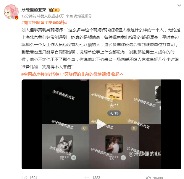 狗仔刘大锤在直播中公开否认黄明昊与鞠婧祎的恋情传闻,并通过对两人行为模式的分析引发舆论热/刘大锤聊黄明昊鞠婧祎:“这么多年这个鞠婧祎我们知道大概是什么样的一个