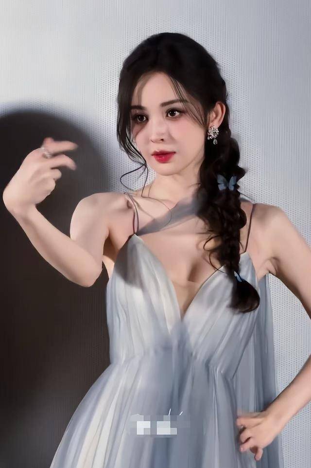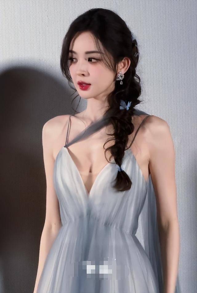 娜扎当天身穿蓝色深V纱纱裙,造型十分公主风,露出了傲人的事业线。