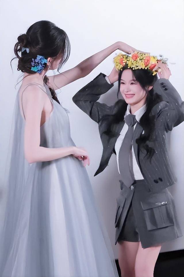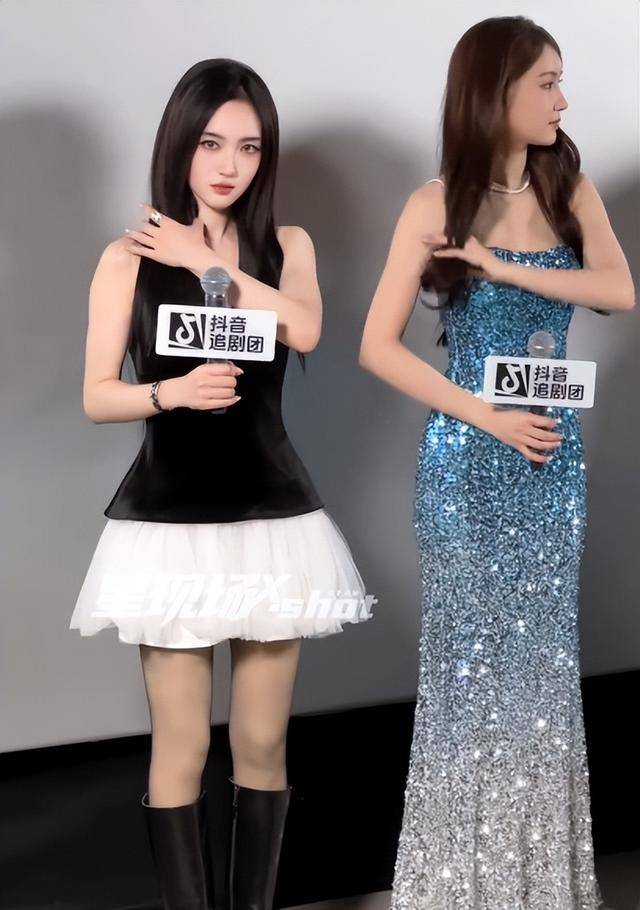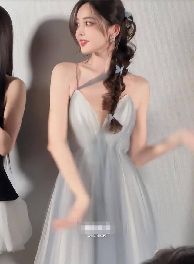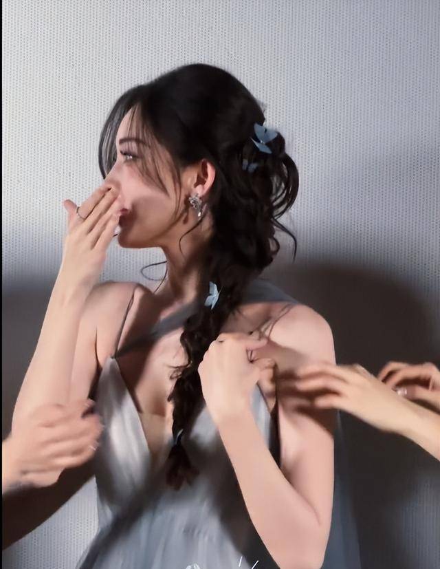 但娜扎很快镇定下来,一边用指尖轻勾试图固定肩带,一边示意身旁工作人员协助。