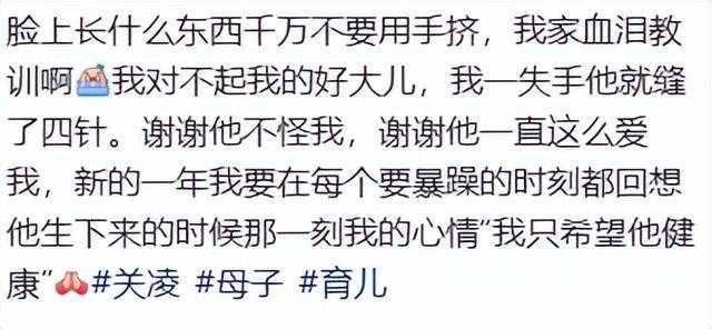 随后还在文章里给儿子道歉:“脸上长什么东西千万不要用手挤,我家血泪教训啊我对不起我的好大儿,我一失手他就缝了四针。”
