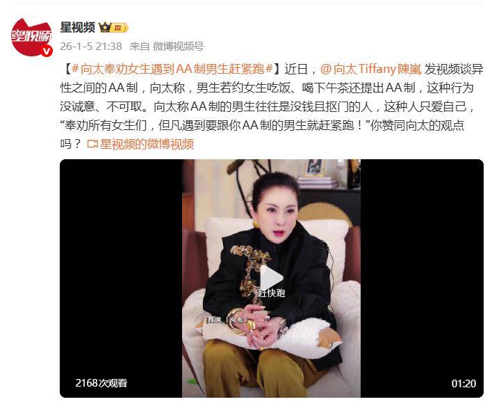 据1月5日报道,向太陈岚一则关于“约会AA制”的犀利发言,又在社交平台上掀起了新一轮的“口水战”。视频里,向太直言不讳:男生约女生吃饭喝下午茶还要提AA?