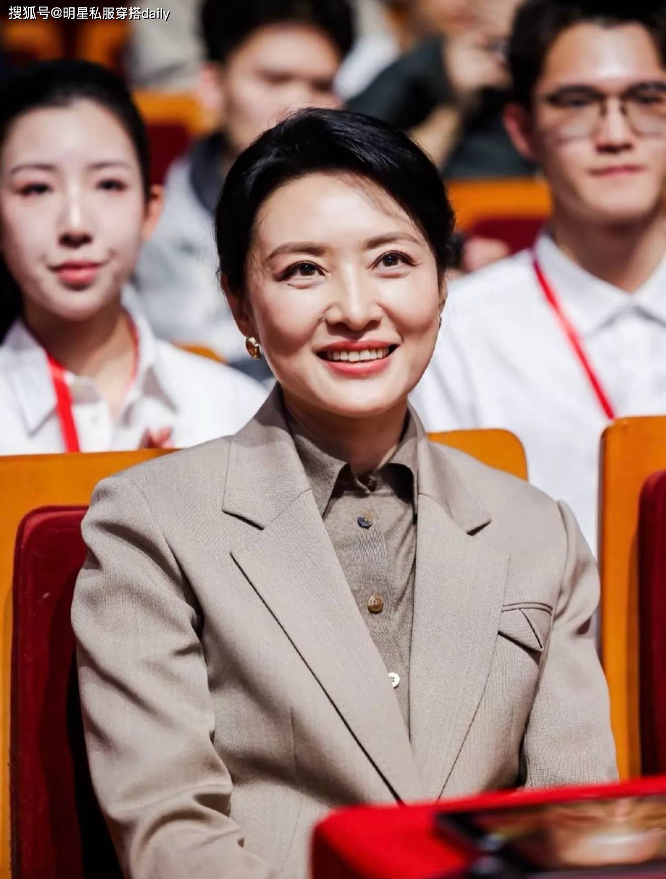 除了日常休闲穿搭,周涛的西装造型也极具借鉴意义。她选择的浅棕色西装,色调柔和不张扬,比黑色西装更显温柔,适配中老年女性的气质;同色系针织衫作为内搭,打造出顺色穿搭的高级感,整体造型和谐统一,尽显从容优雅。