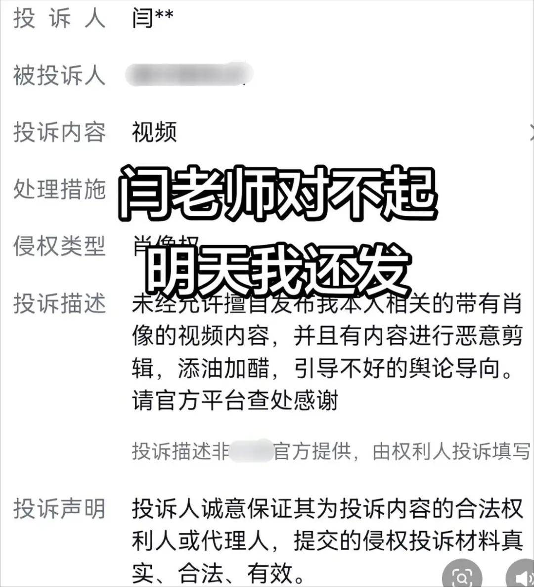投诉人一栏都写着”闫XX”,理由都是侵犯肖像权,这当然一举报一个准儿。