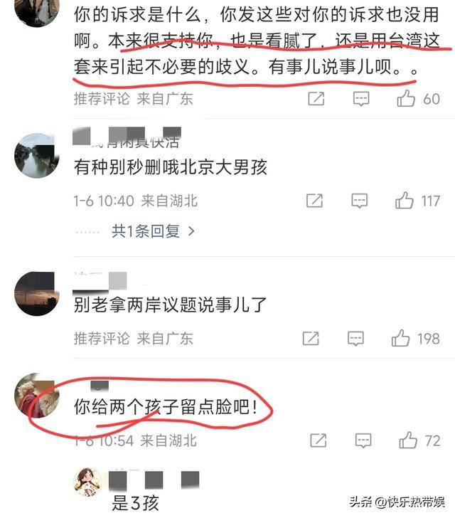 还有网友直接表示,本来挺支持你的,但是现在也看腻了,有事儿说事儿,没必要让人产生歧义,给三个孩子留点脸面,稳重一点吧。