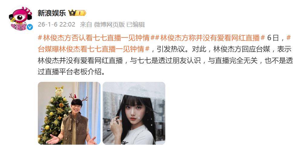 然而,林俊杰经纪公司同日火速回应,措辞明确地否认了这一整套“剧本”。公司强调:林俊杰并没有爱看网红直播的习惯;他与七七的相识与直播完全无关,纯粹是通过朋友介绍;所谓“直播平台老板牵线”更是子虚乌有。这波回应,几乎将台媒爆料的几个关键情节全盘推翻。