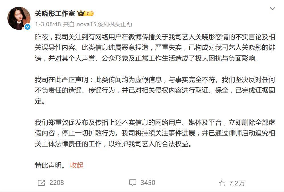 而司晓迪的爆料插曲,更像是一场闹剧。网红司晓迪爆料称与鹿晗有亲密关系,并牵扯关晓彤与王安宇绯闻,鹿晗、关晓彤、王安宇工作室均火速辟谣,强调内容不实并启动法律程序;其提供的所谓“床照”、“同款”证据,被技术党扒出光影矛盾、细节不符,疑似伪造。在这场谣言战中,关晓彤果断采取法律手段,成为唯一正面硬刚诽谤的女方,其冷静果断的形象再次强化。