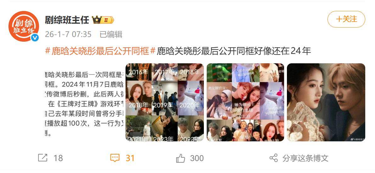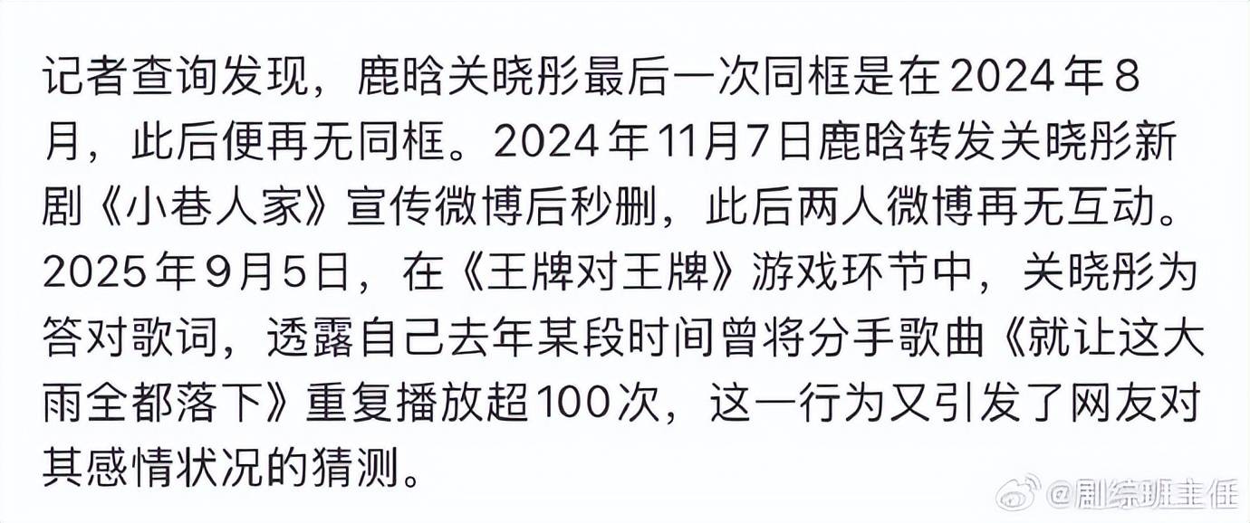 如果说“最后同框”成了罗生门,那2025年之后的种种“切割”操作,则显得清晰又扎心。除了生日祝福的缺席,社交动态上也暗流涌动:鹿晗秒删关晓彤新剧宣传微博,关晓彤工作室抽奖时精准避开CP粉账号。更实锤的是,两人合资的“清晗文化”公司,也在2024年底悄悄完成了注销。这一系列操作,被网友解读为“商业和情感的双重解绑”。