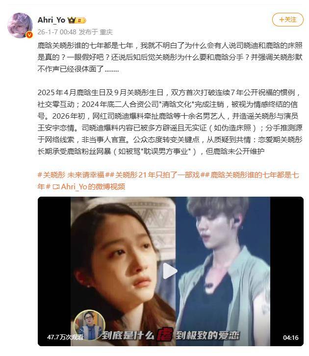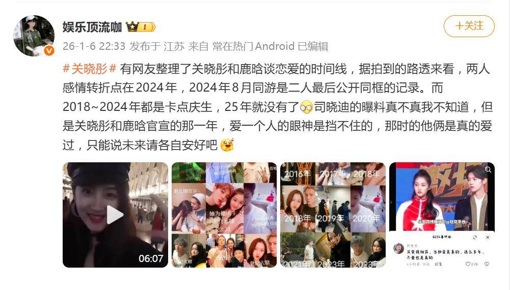 最近,网红司晓迪的一则“亲密关系”爆料,直接把鹿晗和关晓彤送上了风口浪尖。虽然双方工作室火速辟谣、启动法律程序,但这场风波却像一根导火索,在1月7日瞬间引爆了另一个热搜话题——“鹿晗关晓彤最后公开同框”。网友们纷纷化身“福尔摩斯”,开始了一场众多网友参与的“分手时间线”大侦查。