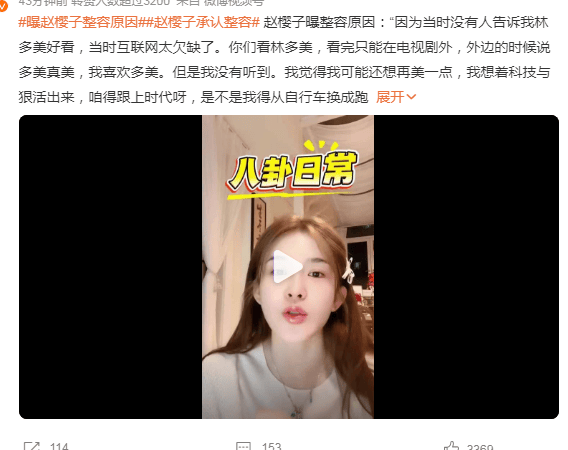 最近,著名女星赵樱子在直播中首次详细解释整容动机,坦言因早年饰演"林多美"时互联网不发达,未获观众对外貌的赞美反馈而误判颜值不足。