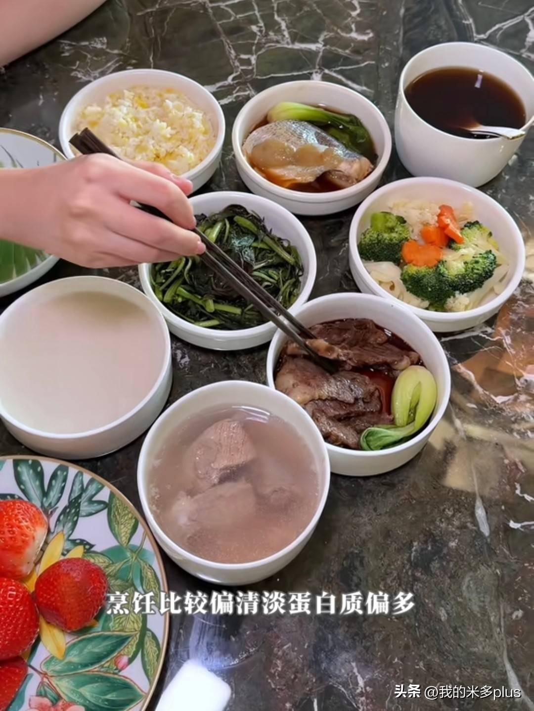 马筱梅特意拍了几张早餐的近照,展现了她一天的开始。早上就有四道菜,包含了荤菜和素菜的搭配,还有两碗汤,以及一份米饭和新鲜的草莓。这样的早餐可谓相当丰盛,而且她每一样都吃一点,力求营养均衡,口味也偏向清淡,符合孕期的需求。