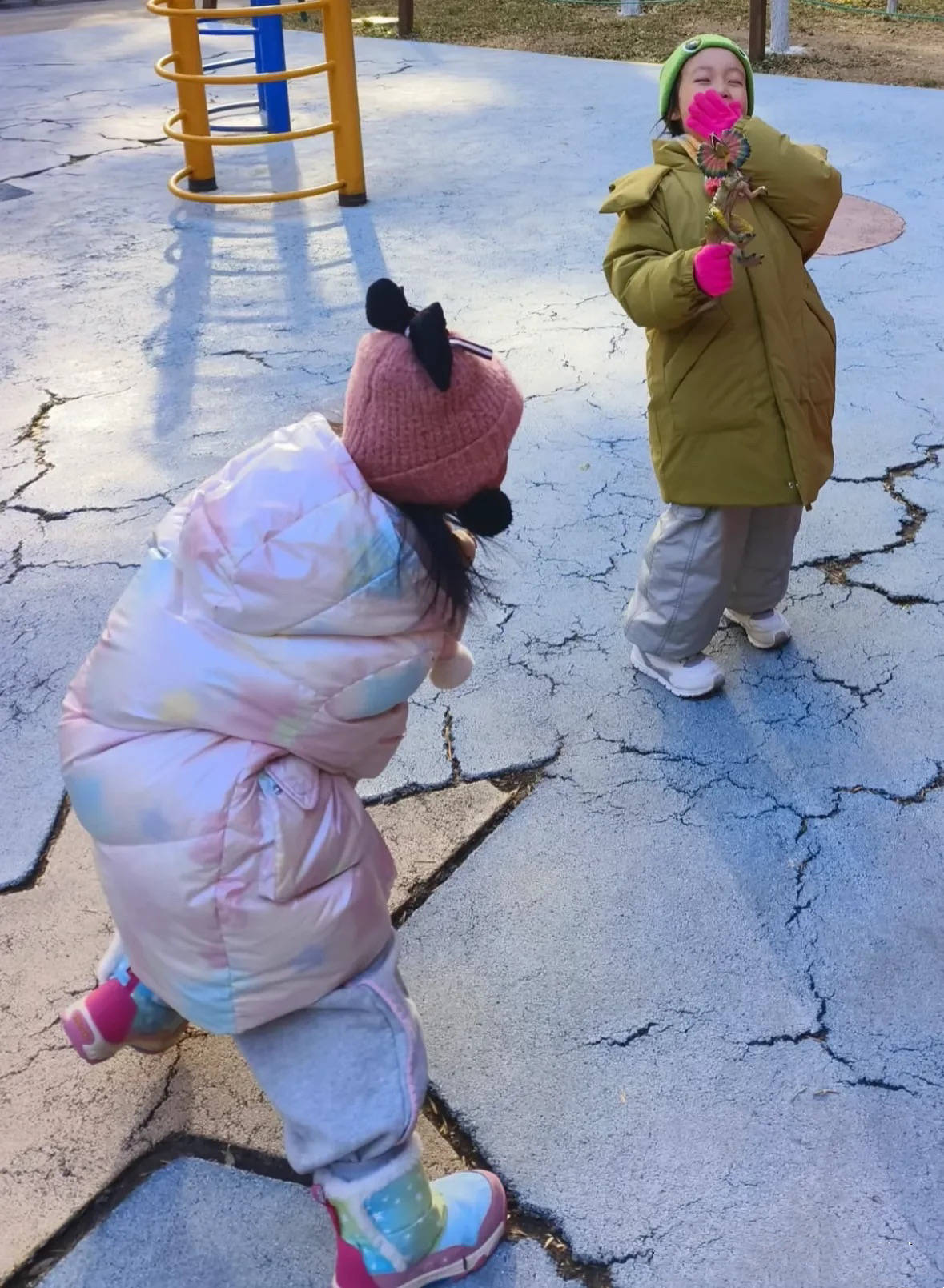 大女儿穿着长款羽绒服,戴着玫红色手套,她捂嘴笑的样子太甜了。王传君经常带着女儿在小广场玩耍,孩子性格特别好。