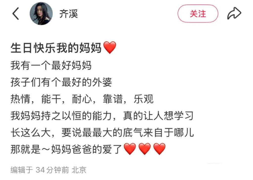 在妈妈生日的时候,齐溪在社交平台晒动态。她穿着碎花裙、留着披肩发,素颜的模样真实自然。