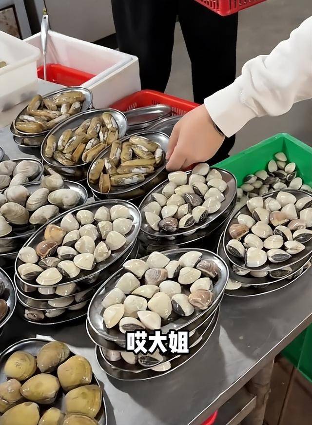 店里的点餐方式很简单,爱吃什么拿什么,大部分长盘子装的食材都只要10块钱,虾、皮皮虾、蛏子、螃蟹、肉丸全是这个价,只有生蚝稍微贵点,13块钱一盘。