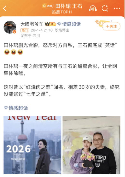 他俩也不是第一次被传婚变了,这波被传是因为田朴珺被网友发现,她清空了自己社交媒体中与王石的合影,仅留下单人视频和节目物料,还退出了多家共同持股公司,夫妻俩的商业关联大幅弱化。