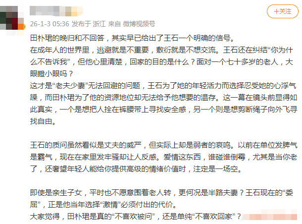 因为这段是田朴珺经过王石提醒才想起来的,再加上她一贯略显夸张的语气,不少人将她的微表情解读为“不耐烦”、“抱怨王石”。接下来的对话似乎也印证了这点,俩人开始讨论起了“更爱自己还是对方”的话题。