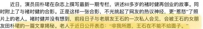 还有一篇讲《75岁创业的褚时健》,合影看着俩人也挺亲近,但褚时健却对媒体表示,那只是一次私人会面,没想到会被田朴珺写成“专访”。他本来也不想跟“王石的女朋友”合影,但是“王石在,不能不给面子”。