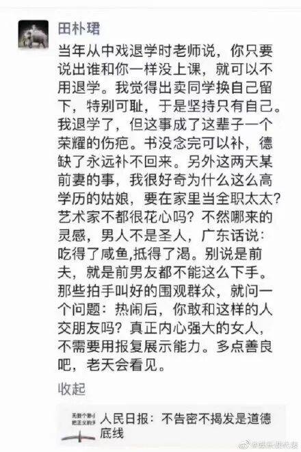 当然,她跟王石在一起疑似“小三上位”、她对外炫耀自己是中戏出身,其实不过是高职班,还被退学了没能毕业、李靓蕾手撕王力宏那阵,她在朋友圈发文指责女方,措辞令人迷惑……这些都是田朴珺被群嘲的原因。