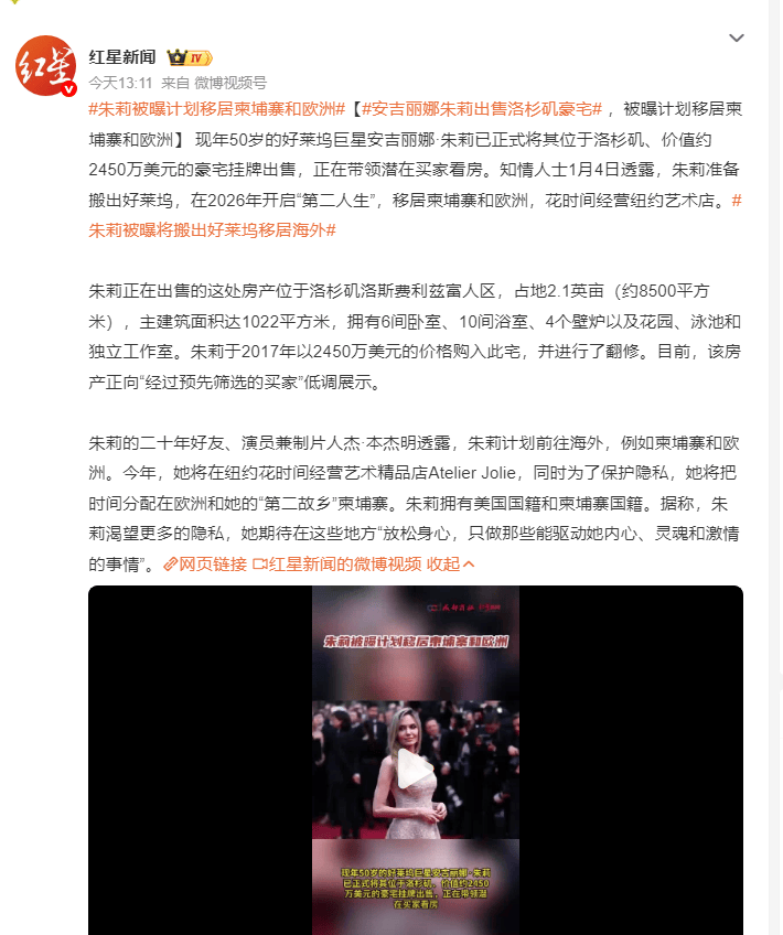 现年50岁的好莱坞巨星安吉丽娜·朱莉已正式将其位于洛杉矶、价值约2450万美元的豪宅挂牌出售,正在带领潜在买家看房。知情人士1月4日透露,朱莉准备搬出好莱坞,在2026年开启“第二人生”,移居柬埔寨和欧洲,花时间经营纽约艺术店。