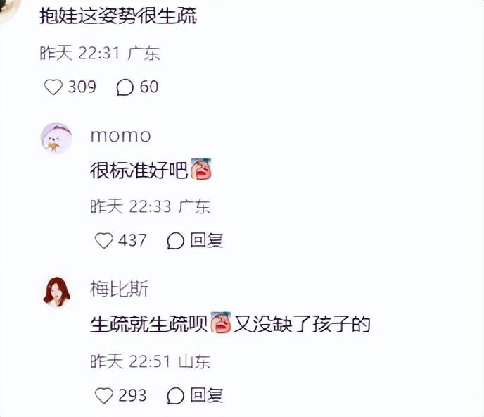 细看这段视频,就能感觉到网友为什么会有这种感觉,她明明是在抱娃、哄娃,但表情依然很精致,跟其他宝妈状比起来没那么生动。