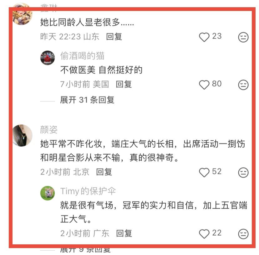 郭晶晶平时不化妆,素颜的状态多少有点显老。但她属于那种很端庄大气的长相,每次出席活动一打扮,从来都不输女明星。大概这就是冠军自带的气场!