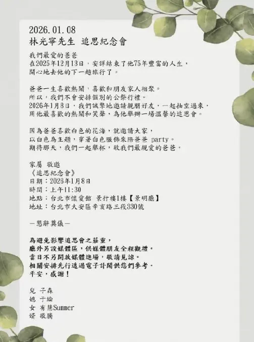 据台媒报道,知名艺人萧敬腾的岳父林光宁先生,此前于上个月13日因病情危急,经医治后最终离世,享寿75岁。家属在经过商议后,已确定于本月8日近午时分,在台北市为其举办告别仪式。