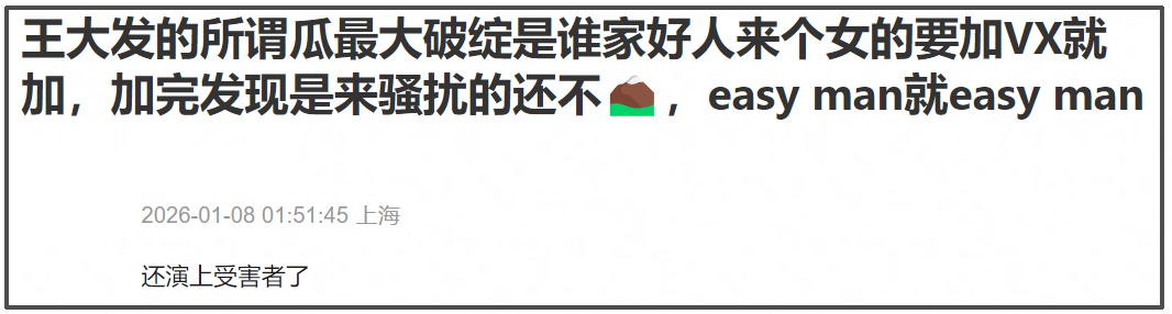 甚至王大发还直言认识大概率是真的,还说基本上前三天不会拒绝一个非常主动和你聊天的朋友,啊?男明星都这么闲这么热情吗?有空认识网红,还有空加网红好友聊天?怎么没有空回复粉丝评论呢?