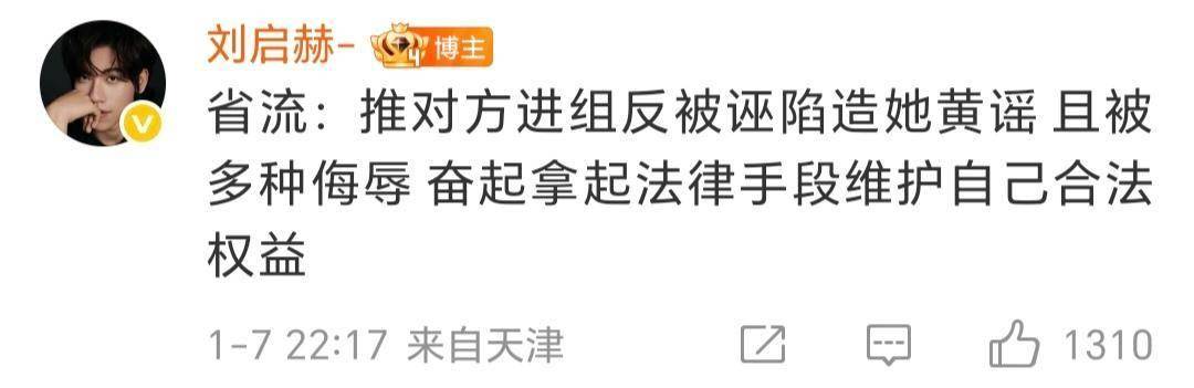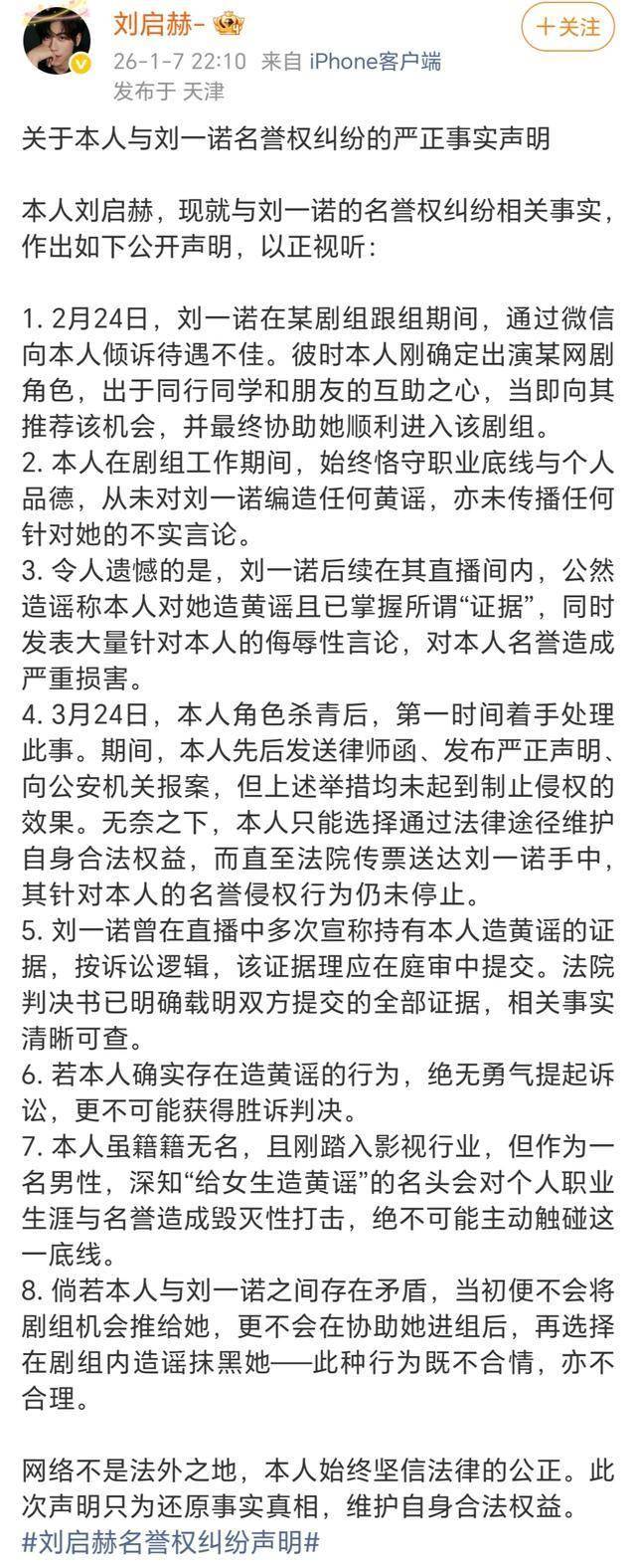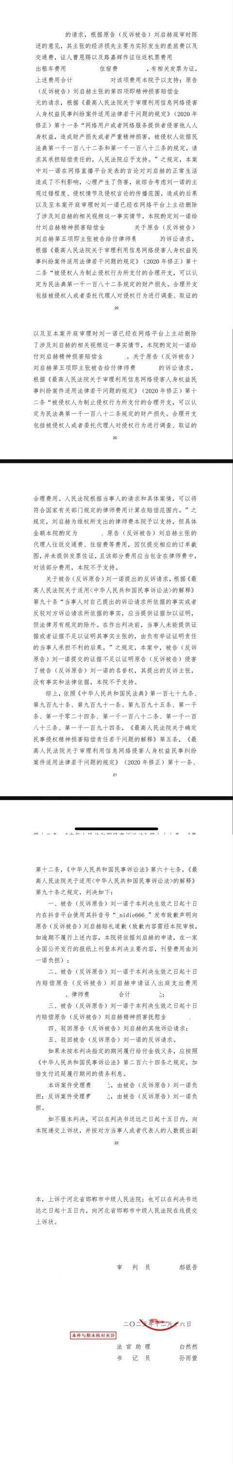 1月8日晚,刘启赫艾特了她,并放出了法院的民事判决书,内容很长,一共有23页,简单说就是他告了她,然后胜诉了。