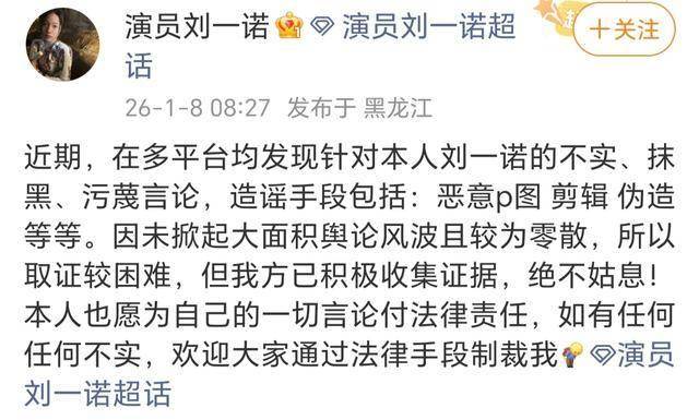 今天(1月8日)早上,刘一诺再发声,称网络上出现关于她的不实言论,已开启告黑流程。她还放话,“如有任何不实,欢迎大家通过法律手段制裁我”。