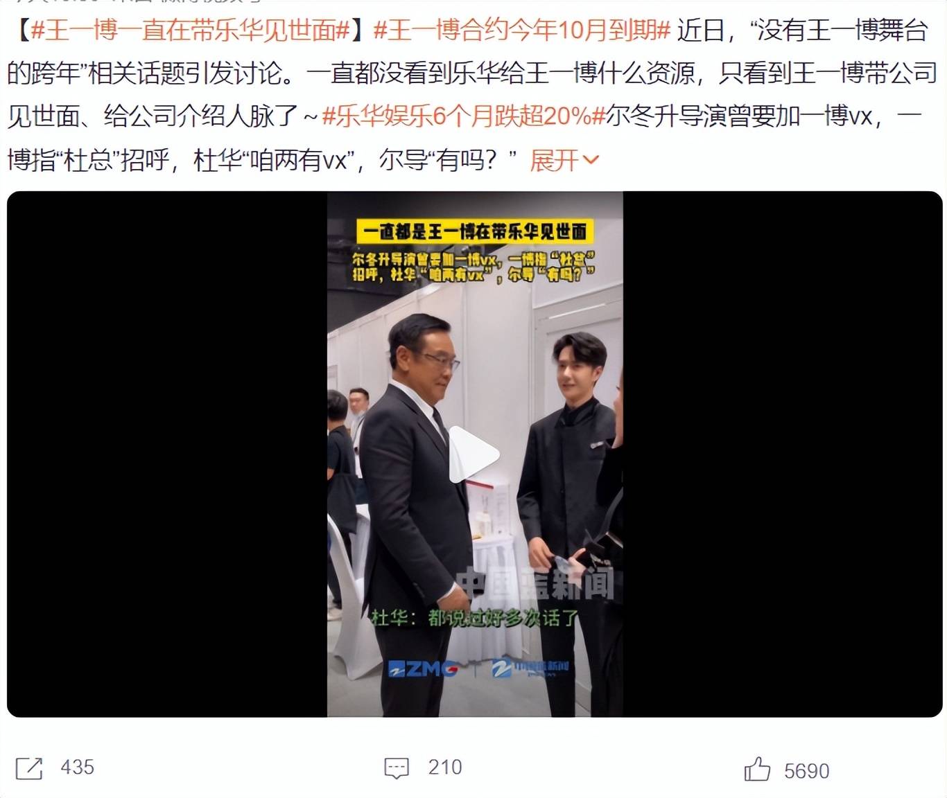 网友们一直在讨论,王一博的合约到期后,他会不会选择和乐华续约,当网上传出王一博合约到期不续约的消息后,杜华和王一博一起出席《探索新境2》首映会现场。