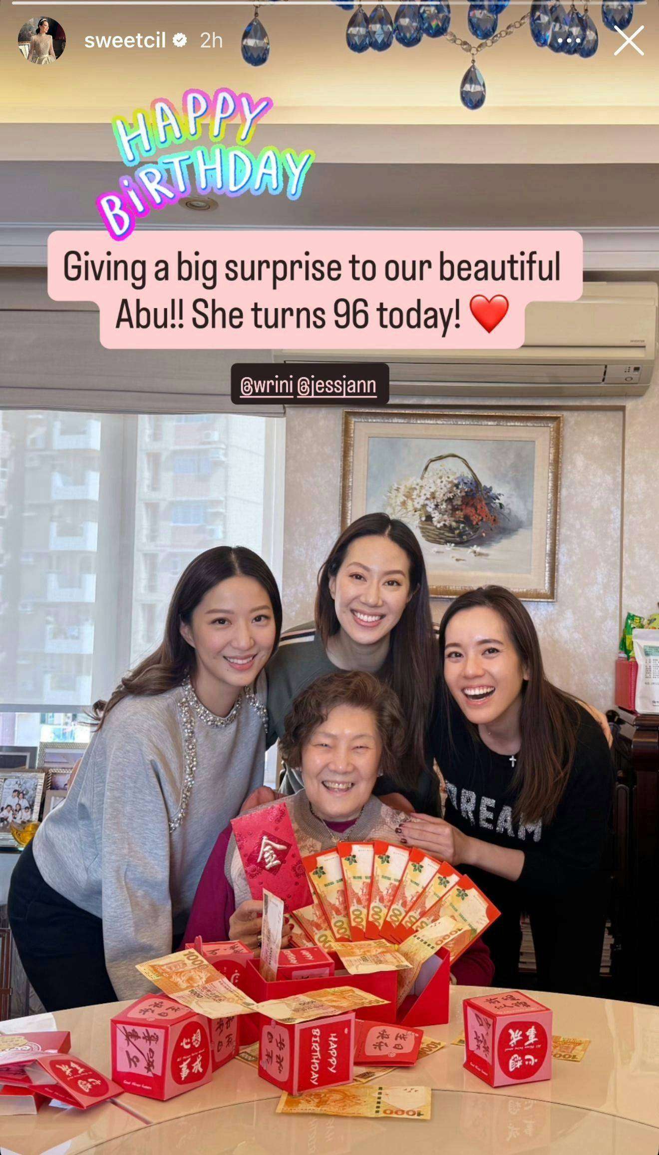 最引人注目的是照片中散落在桌上的千元港币现钞。经过换算,这些被网友称为“金牛”的纸币总额超过1.7万元人民币,外婆手中还握着一叠千元港币和红包,笑容满面。汪诗诗配文写道:“给我们漂亮的Abu一个大惊喜!她今天96岁啦!”
