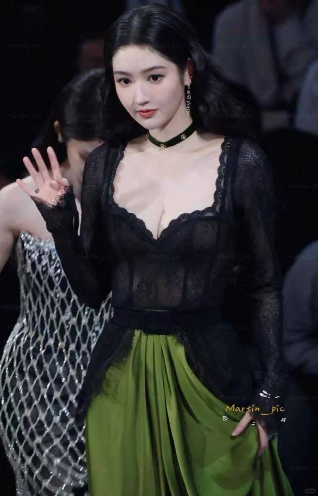 就像星光大赏上,她身着黑纱墨绿拼接的暗夜森系长裙,搭配金属束腰,勾勒出完美曲线。