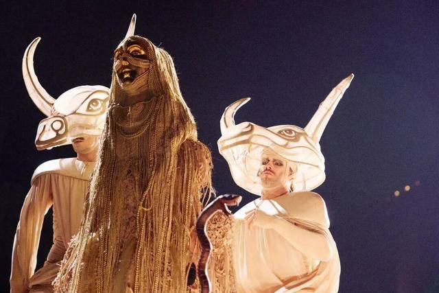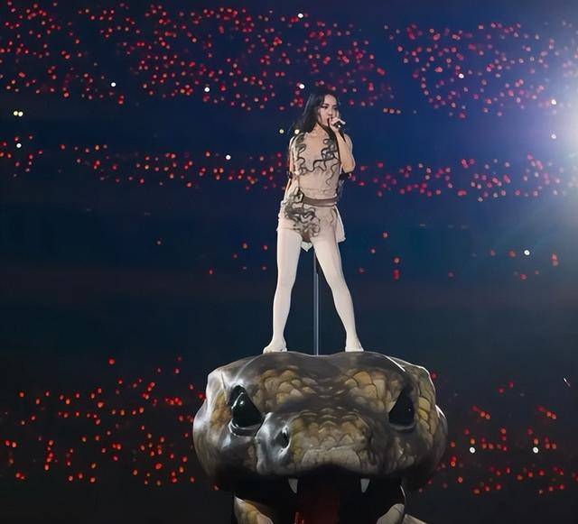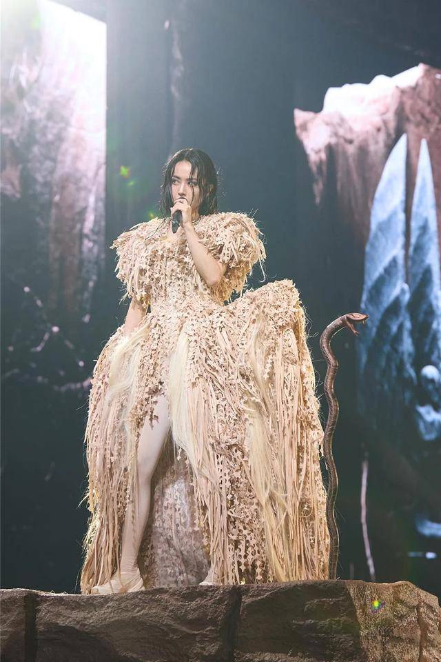 蔡依林站在巨蟒头上,身着华丽的演出服,宛如女王降临,霸气十足。