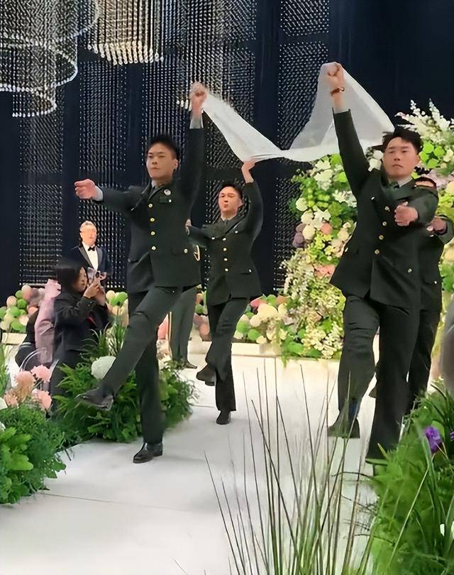 他的伴郎团清一色都是他曾经的国旗护卫队战友,他们穿着统一的军装,身姿挺拔,眼神坚定,仿佛又回到了当年执行任务的时候。