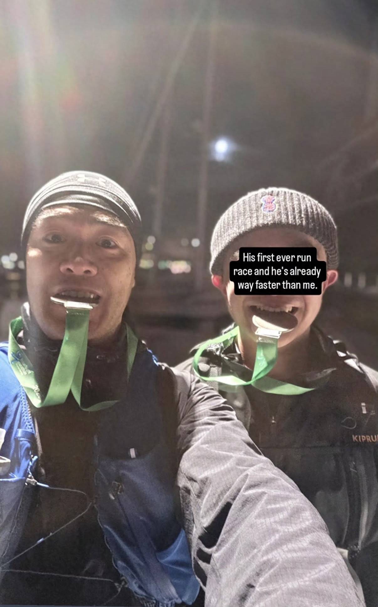 2026年新年,刘鸣炜是在与儿子跑马拉松比赛中开始的。他罕见晒出了父子合照,两人参加了当地的马拉松赛事,在赛后获得了奖牌,所以合照纪念。当地天气寒冷,父子俩都穿了冲锋衣,戴上了毛线帽,对着镜头都很兴奋,并且都咬着奖牌——咬着奖牌拍照是刘鸣炜在马拉松比赛结束后拍照时的招牌动作。如今这个招牌动作也“传染”到了儿子身上,儿子也咬着奖牌留影。刘鸣炜的儿子已经17岁了,充满着朝气,他戴了一顶毛线帽,上面还绣着“香港”二字。照片中,他咬着金牌绽放笑容,不过眼睛被刘鸣炜遮住了,就这么看他长得与刘鸣炜同高,神韵也挺像刘鸣炜的。