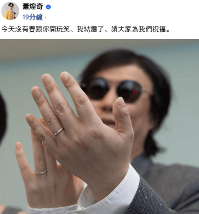 据台媒,8日,歌手萧煌奇晒出无名指婚戒官宣结婚:“今天没有要跟你开玩笑,我结婚了,请大家为我们祝福。”