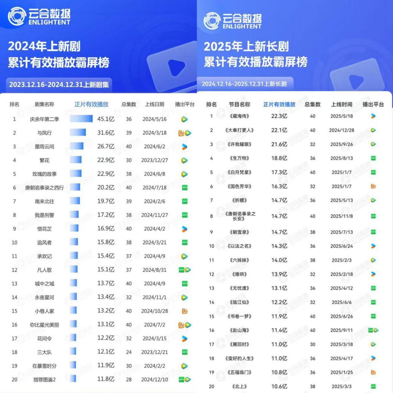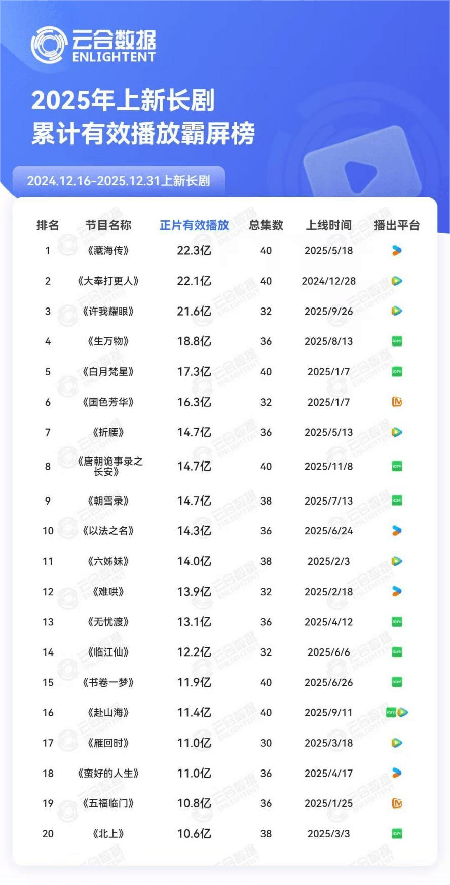 近日,云合数据正式公布2025年长剧集网播年度核心数据,其中两大榜单尤为值得关注——2025年上新长剧累计有效播放霸屏榜与2025年上新长剧热播期集均有效播放排行榜