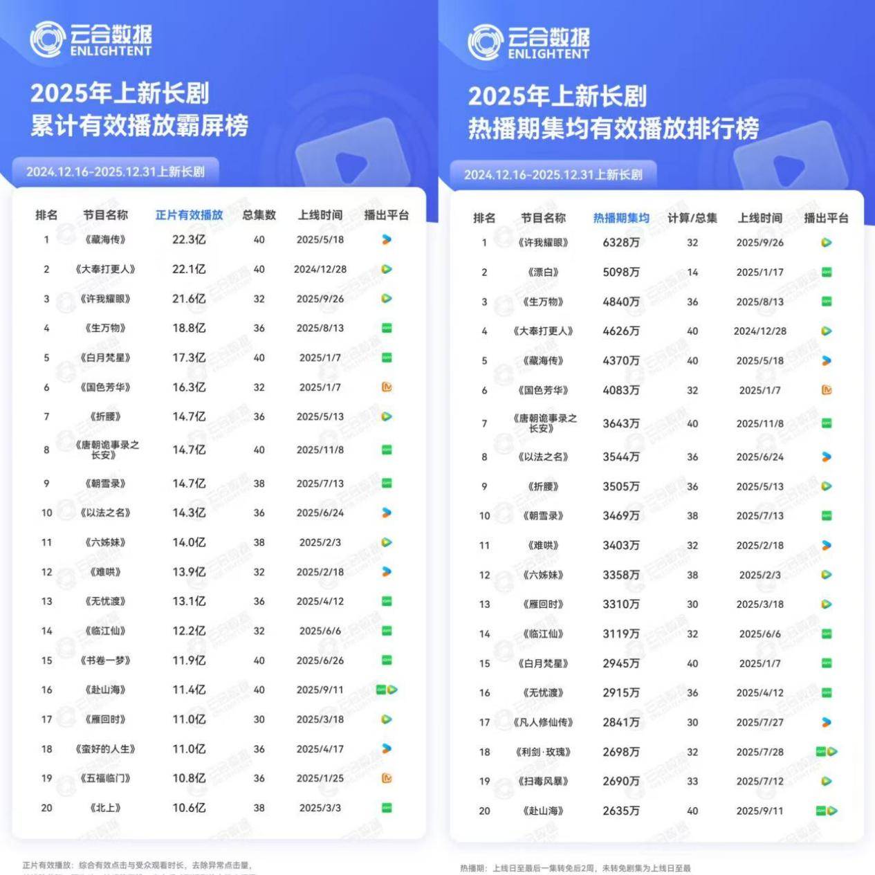 这两组数据从不同维度勾勒市场全貌:累计有效播放量侧重长线价值与口碑沉淀,热播期集均数据则能抹平剧集长度差异,直观反映作品播出期间的即时火爆程度。