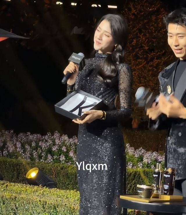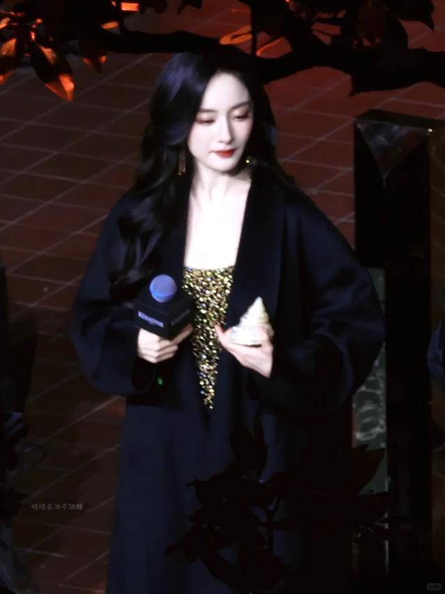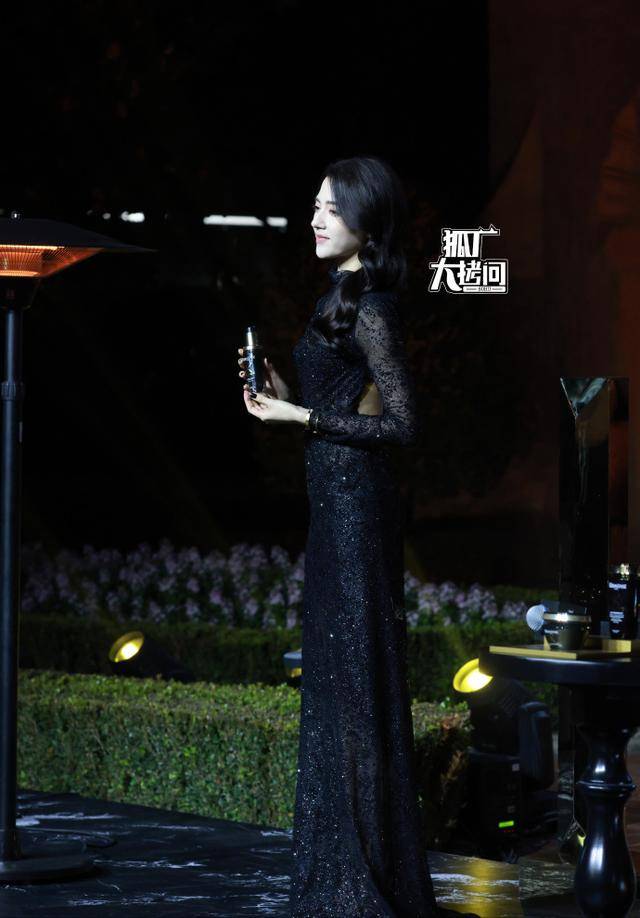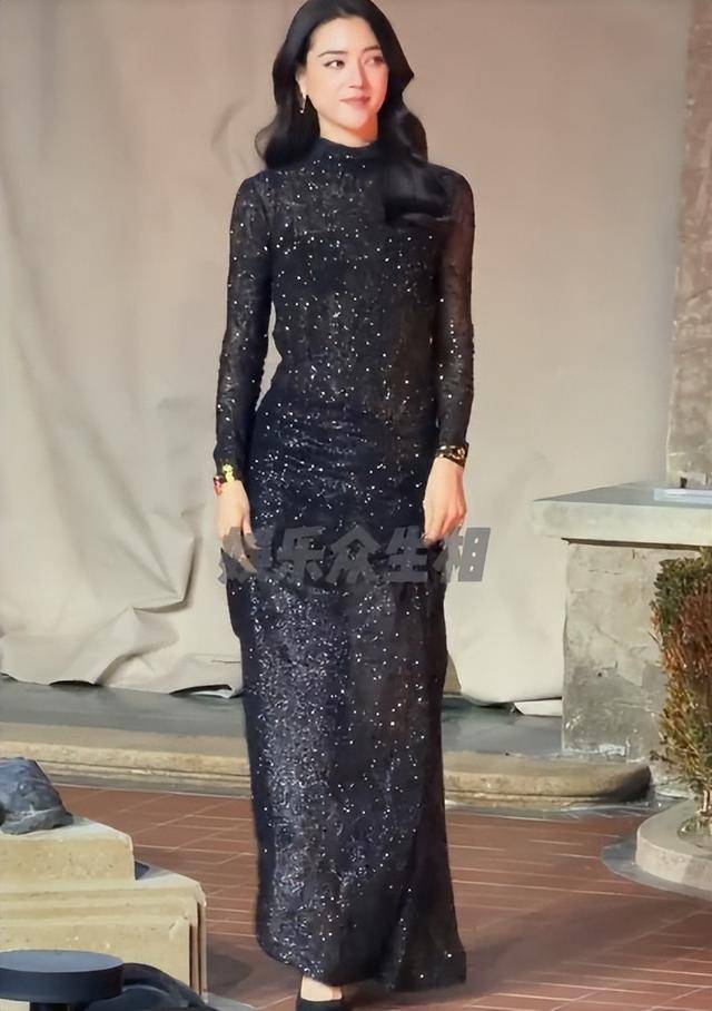 这次的黑色长裙,虽然遮住了她引以为傲的身材优势,但亮片在灯光下闪烁,让她整个人像从银河中走来。