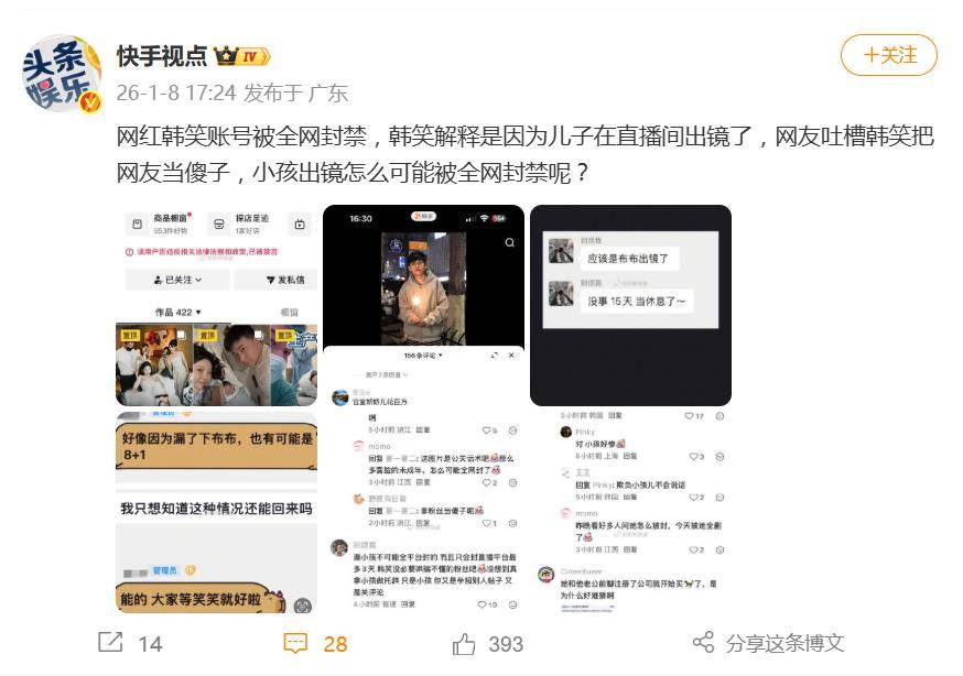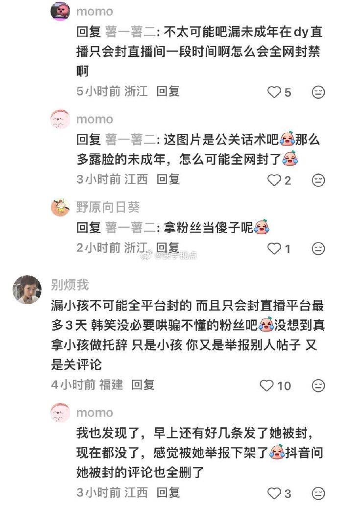 网友们的火眼金睛可不是白长的。很快就有资深用户指出,根据各大平台常规操作,未成年人偶然出镜,最常见的处罚是直播间被短期中断或封禁几天,比如三天。参考之前网红韩安冉孩子也曾直播露脸,并未招致全网账号被“连锅端”的顶级处罚。对比之下,韩笑这次被全平台同步封禁、账号搜索不到的待遇,规格显然高得离谱。