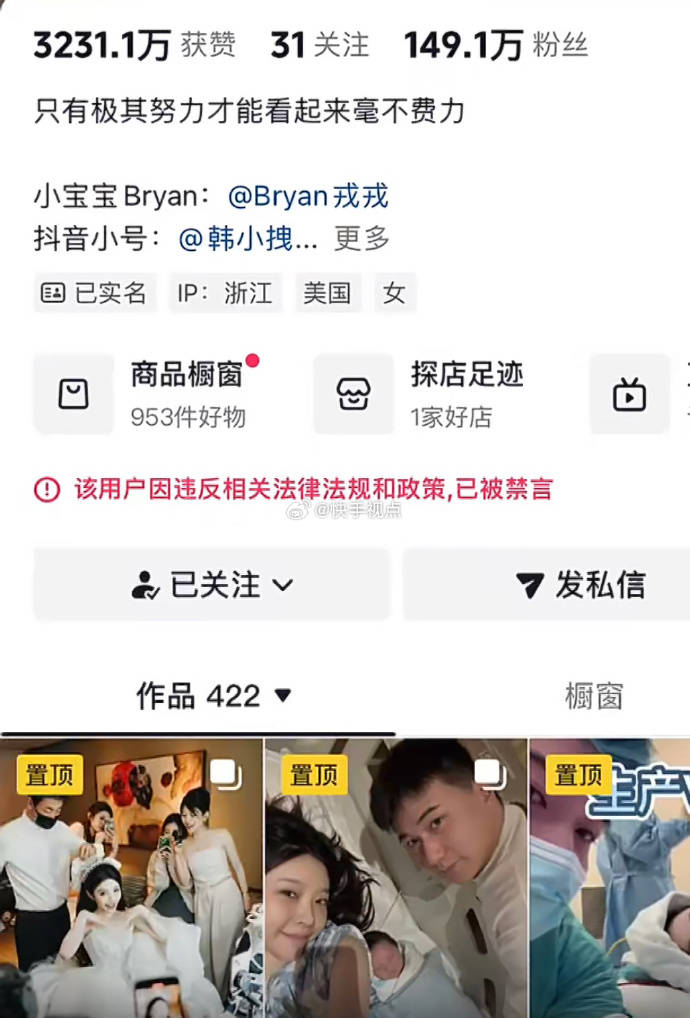 网红韩笑一夜之间被全网封禁的消息,瞬间冲上了风口浪尖。面对自己抖音、快手等平台账号被集中封禁、主页显示“违反相关法律法规和政策”的醒目提示,韩笑本人通过粉丝渠道给出的解释却让全网愣住了:只因直播时儿子Bryan意外露了个脸。