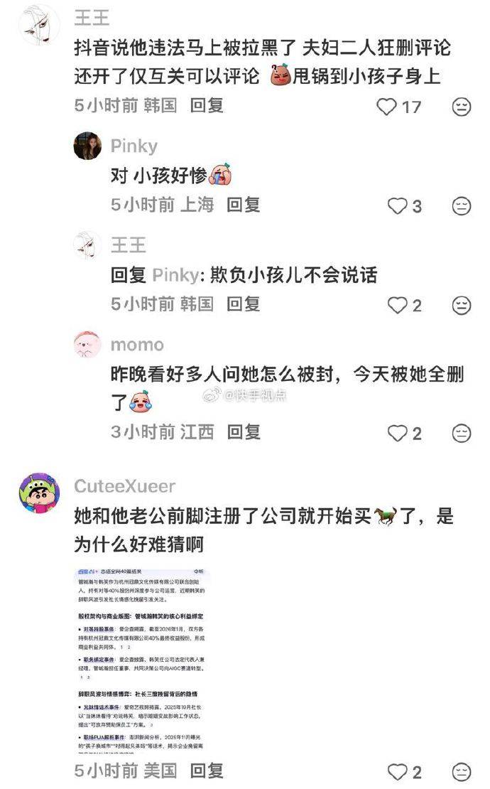 更引发猜疑的是事发后的一系列“捂盖子”操作。有网友发现,韩笑夫妇迅速删除了讨论封禁原因的评论,并将账号设置为“仅互关好友可评论”,部分网络上的爆料帖文也神秘消失。这套“限制评论+举报下架”的组合拳,被犀利吐槽为“经典危机公关,甩锅给不会说话的孩子”。