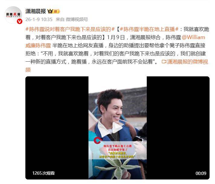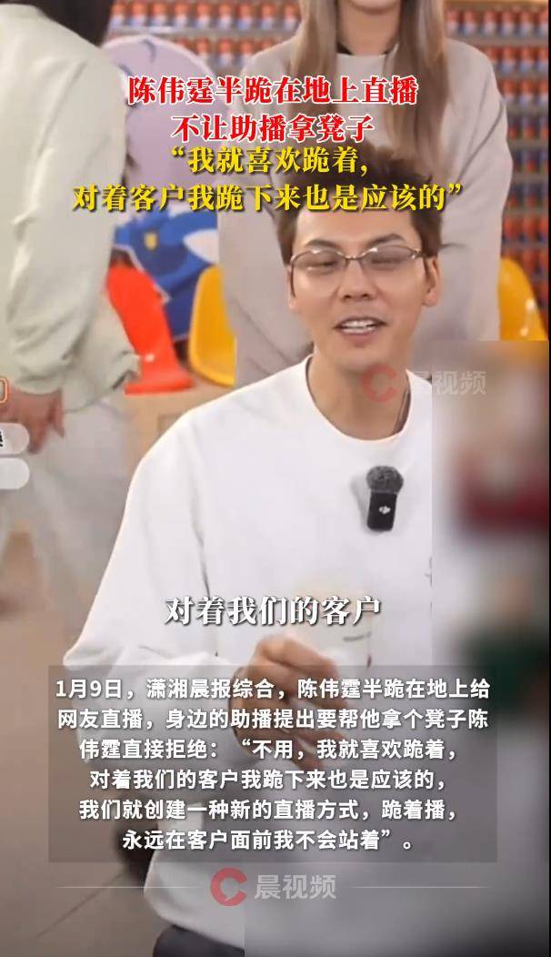1月9日,一场品牌直播让陈伟霆以意想不到的方式“出圈”了。画面里,他全程半跪在地上与网友互动,身边助播看不下去要给他搬凳子,却被他一口拒绝:“不用,我就喜欢跪着,对着我们的客户我跪下来也是应该的,我们就创建一种新的直播方式,跪着播,永远在客户面前我不会站着。” 这段发言瞬间点燃网络,一场关于明星姿态、职业精神乃至服务文化边界的讨论就此炸开。