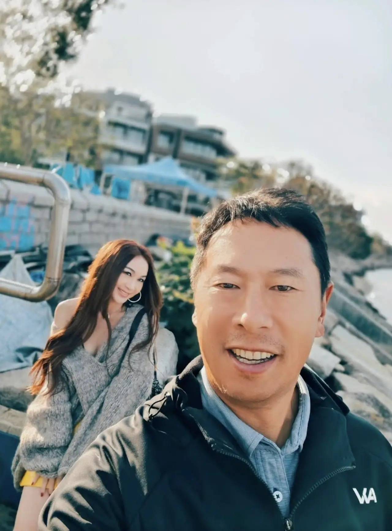 即便是在室外拍照的时候,温碧霞也穿着吊带裙、怀里还抱着一只可爱的白色小狗。他的继子坐在她身后,看起来感情不错。