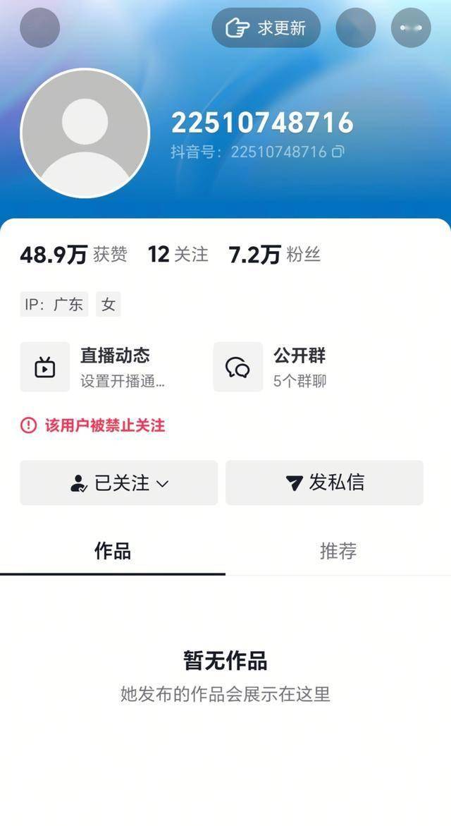 但是,不知道具体几点的时候,她的账号突然被封了,头像不见了,昵称变成一串数字,所有作品也没有了。有网友取关了之后再关注就关注不了。
