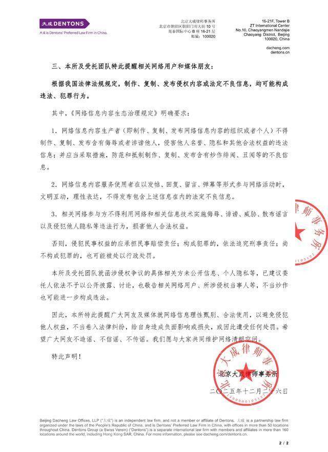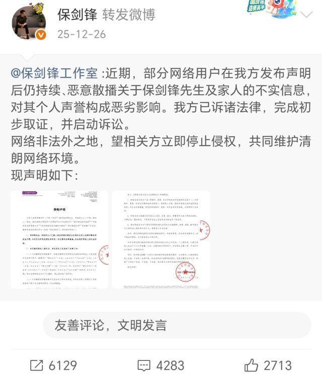 同月26日,他转发了工作室的声明。工作室声明称,已诉诸法律,完成初步取证,并启动诉讼。