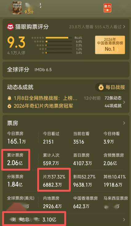 根据猫眼平台的数据,《寻秦记》在2亿票房的前提下,片方可以获得6000多万的回报。