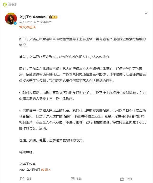 面对如此恶劣且持续的行为,文淇工作室于1月9日迅速发布严正声明,表示已对此次事件完成取证,态度坚决地表示“绝不姑息侵权行为”,并承诺未来将进一步加强安保措施。这份声明,获得了网友的一致支持。