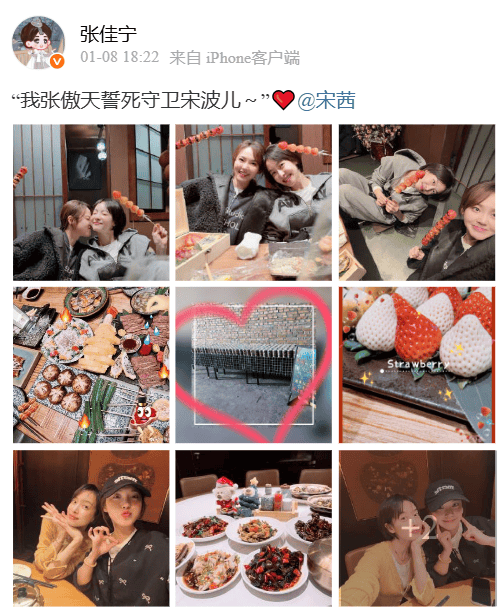宋茜正在剧组拍新剧,张佳宁直接送全剧组的工作人员喝奶茶,在这个冬天也是特别的暖和了,在1月8日,张佳宁还在社交平台上晒出和宋茜的聚餐照,配文:我张傲天誓死守卫宋波儿~还配了一个红色爱心,这关系已经到铁子的地步了。